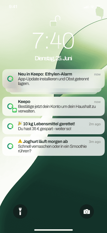 Sanfte Push‑Hinweise informieren dich rechtzeitig – handeln statt wegwerfen, ganz ohne Stress.